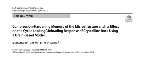 近日,黄土力学与灾害防治团队在岩石微观力学方面取得新进展,相关成果以《Compression?Hardening Memory of the Microstructure and Its Effect on the Cyclic Loading/Unloading Response of Crystalline Rock Using a Grain?Based Model》为题发表于岩石力学领域著名期刊Rock Mechanics and Rock Engineering。黄晓林特聘研究员为论文第一作者,许领教授为论文通讯作者,研究得到了国家自然科学基金的资助。