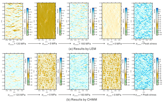 图4 基于(a)LEM和(b)CHMM模拟的循环压缩过程中最小主应力的分布