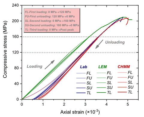 图3 通过实验、LEM和CHMM模拟得到的金川花岗岩循环压缩过程中的应力-应变曲线