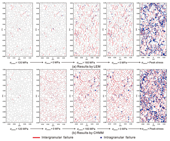 图5 结晶岩模型在循环压缩过程中的渐进破坏特征:(a) LEM模拟结果;(b) CHMM模拟结果。红色和深蓝颜色分别表示晶间和晶内失效