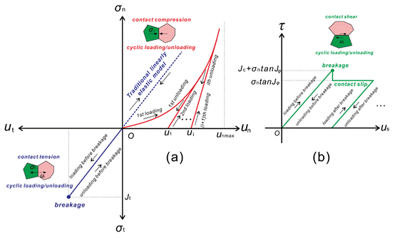 图2 UDEC-GBM模型中颗粒接触的变形和强度模型。(a)压缩和拉伸情况;(b)剪切情况。