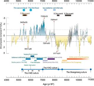 研究结果表明,杭州湾南部最早的新石器文化-上山文化在温暖湿润的气候条件下蓬勃发展,持续时间近1500年,并终结于9.2 ka事件和8.2 ka事件之间的干燥时期;跨湖桥文化是杭州湾南翼第一个展现出独特海洋文化特征的新石器文化,期间发生了两次大规模的极端湿润事件,分别在距今8171 ± 31-7926 ± 47 yr B.P和7291 ±60-7038 ± 55 yr B.P,第二次极端洪涝事件与跨湖桥文化的衰落时间一致,进一步支持了“洪水衰亡假说”;河姆渡文化的兴盛主要发生在温暖湿润的气候条件下,而早期文化与晚期文化之间存在一次中断,可能与极端湿润气候导致的水患有关。河姆渡文化晚期旱涝灾害频发以及5.5 ka 极端降温事件的发生,可能是导致河姆渡文化最终衰落的重要气候因素(图2)。