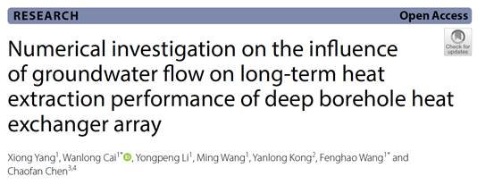 在《Geothermal Energy》期刊上发表的论文题目为“Numerical investigation on the influence of groundwater flow on long-term heat extraction performance of deep borehole heat exchanger array”。团队针对中深层地埋管群供热系统开展了地下水渗流影响下的长期性能分析及管群内交互特性量化研究。此外,还进行了管间负荷迁移特性分析及地温场变化规律研究,相关结论可为相关工程设计提供参考。中心博士生杨雄为论文第一作者,王沣浩教授及蔡皖龙助理教授为论文共同通讯作者。