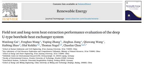 Wanlong Cai, Fenghao Wang, Yuping Zhang, Jinghua Jiang, Qiuwang Wang, Haibing Shao, Olaf Kolditz, Thomas Nagel, Chaofan Chen*. Field test and long-term heat extraction performance evaluation of the deep U-type borehole heat exchanger system[J]. Renewable Energy (2024): 122171.