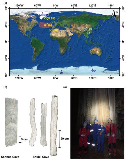 图1. 研究区域及样品。(a)三宝洞(SB,110°26′E,31°40′N)和水西洞(SX,106°23′E,27°3′N)的洞穴位置。(b)研究石笋样品切面图。(c)研究人员于2023年在水西洞内的合影(王可欣拍摄)。