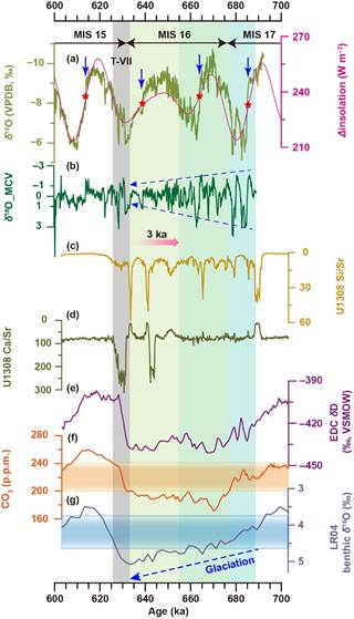 图2. 过去69到60万年的洞穴石笋氧同位素(δ18O)记录和其他记录的对比。(a)该研究提供的石笋δ18O记录(绿色)和太阳辐射变化(粉色)。(b)石笋记录中指示的千年尺度亚洲夏季风变率。(c)和(d)北大西洋冰筏碎屑变化。(e)南极冰芯氢同位素(δD)记录。(f)大气CO2记录。(g)海洋底栖有孔虫记录?;疑醮硎颈谥罩蛊冖鳎渌醮硎镜鹘谇瓯渎收穹浠娜?/span>CO2和冰量条件。橙色和蓝色水平条带分别表示中等冰期条件下的CO2和冰量状态。