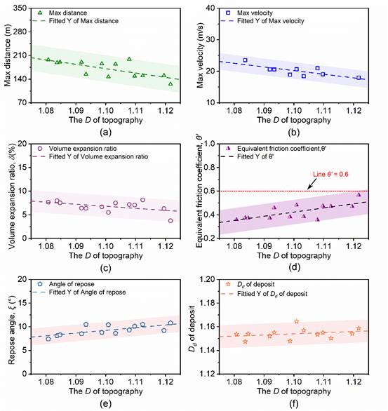 图5 滑坡特征参数与阶地地形分形维数之间的统计关系:(a)最大运动位移(L);(b)滑动体的最大速度(vm);(c)滑坡的体积扩容系数(δ);(d)滑坡的等效摩擦系数(θ');(e)堆积体的休止角(ξ);以及(f)堆积体的分形维数(Dd)。红色虚线代表长滑坡与短滑坡之间的临界值。