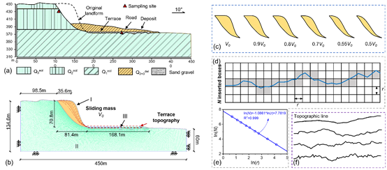 图1 (a) 大堡子黄土滑坡地质剖面图;(b)大堡子滑坡FDEM模型示意图定边界;(c) 考虑了不同滑体体积的滑坡模型。(d)~(f) 地形起伏度的分形维数计算原理。