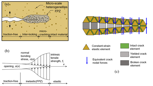 图2 FDEM中材料破坏建模原理:(a) 非均质材料中拉伸裂纹的概念模型。(b) 非线性破坏过程模型(FPZ)。(c) FDEM中FPZ的模拟示意图,使用矩形弹性元件和三节点裂纹元件分别表示块状材料和裂缝。