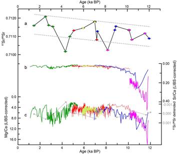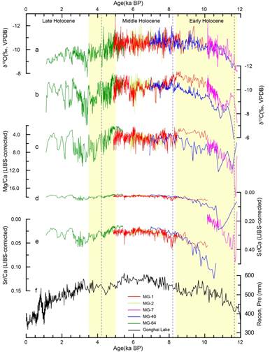 研究还发现,石笋??Sr/??Sr比值在全新世整体呈上升趋势(图2),可归因于上覆黄土沉积的持续成壤作用;其波动则与土壤和基岩来源锶的比例变化有关,进一步印证了水文气候的干湿交替。