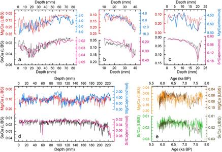 石笋δ18O是研究亚洲季风强度变化的重要指标,但在指示区域水文变化上存在较大不确定性,需要结合其他指标以重建水文气候变化。团队选取了五根马沟洞全新世石笋样品,利用激光诱导击穿光谱(LIBS)和电感耦合等离子体发射光谱(ICP-OES)技术,分析了石笋的镁钙比(Mg/Ca)和锶钙比(Sr/Ca),并结合锶同位素(??Sr/??Sr)进行多指标综合分析。