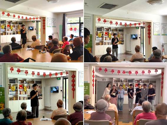 活动伊始,养护院办公室副主任张庆与2023级学硕党支部副书记宋敏行对端午节的历史起源、节日习俗等展开介绍。在随后的节目表演环节中,支部成员李钊旭以一首热情洋溢的《水手》拉开序幕,随后养护院工作人员献唱一首《甜蜜蜜》,还有支部成员的《大观楼长联》、《青花瓷》等表演,活动现场气氛热烈,充满欢声笑语。最后全体志愿者共同合唱《我和我的祖国》,将演出气氛推向高潮,精彩的表演赢得老人们和工作人员的阵阵掌声。
