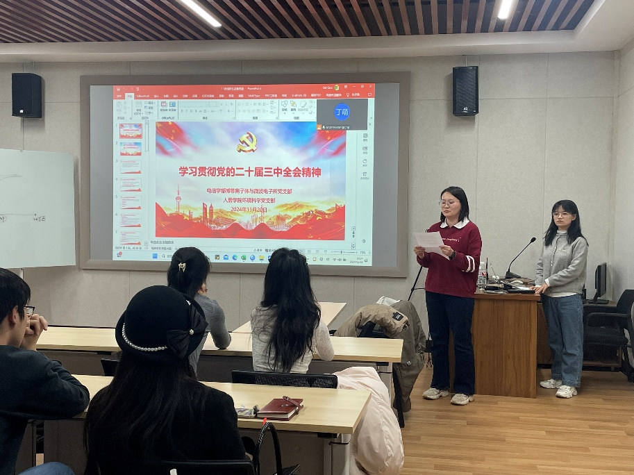 2024年11月20日,人居学院环境科学党支部与电信学部博等离子体与微波电子所党支部,在线上、线下联合开展了以“学习贯彻党的二十届三中全会精神”为主题的组织生活会,集体学习党的二十届三中全会审议通过的《中共中央关于进一步全面深化改革、推进中国式现代化的决定》(以下简称《决定》),支部全体学生党员、发展对象、积极分子参加,本次活动由电信学部博等离子体与微波电子所党支部支部书记郭丁萌和人居学院环境科学党支部博士生党小组副组长王路主持。