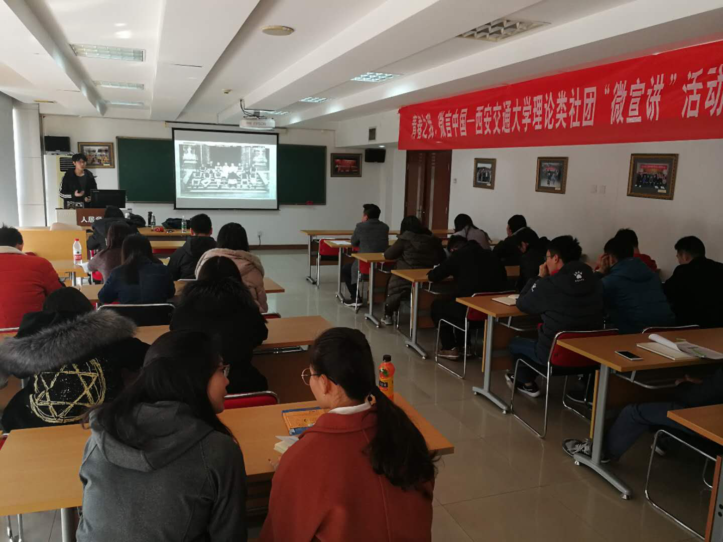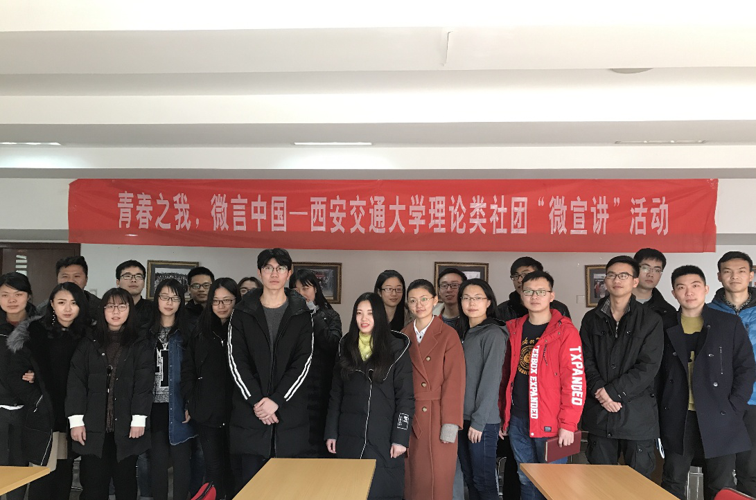 2017年12月21日星期四下午,人居学院硕6120&6121党支部联合举办青春之我微言中国——西安交通大学筑梦社十九大精神“微宣讲”活动,活动中有幸邀请到马列读书社的崔玉改同学和交大解说团的吴师保同学与大家分享各自有关“十九大”的精神体会。
