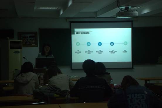 活动开始后,赵涛向同学们整体介绍了活动内容、活动目的以及活动意义。之后,参加暑期政府见习的优秀同学代表王海峰、崔远浩、温赫分别介绍了政府见习的报名流程,见习过程中所从事的工作,政府见习时应保持的心态以及政府见习带来的收获等内容。活动最后,副主席赵涛对今天的活动进行了总结,并对今后想要参加政府见习的同学给予了一些指导性的建议。