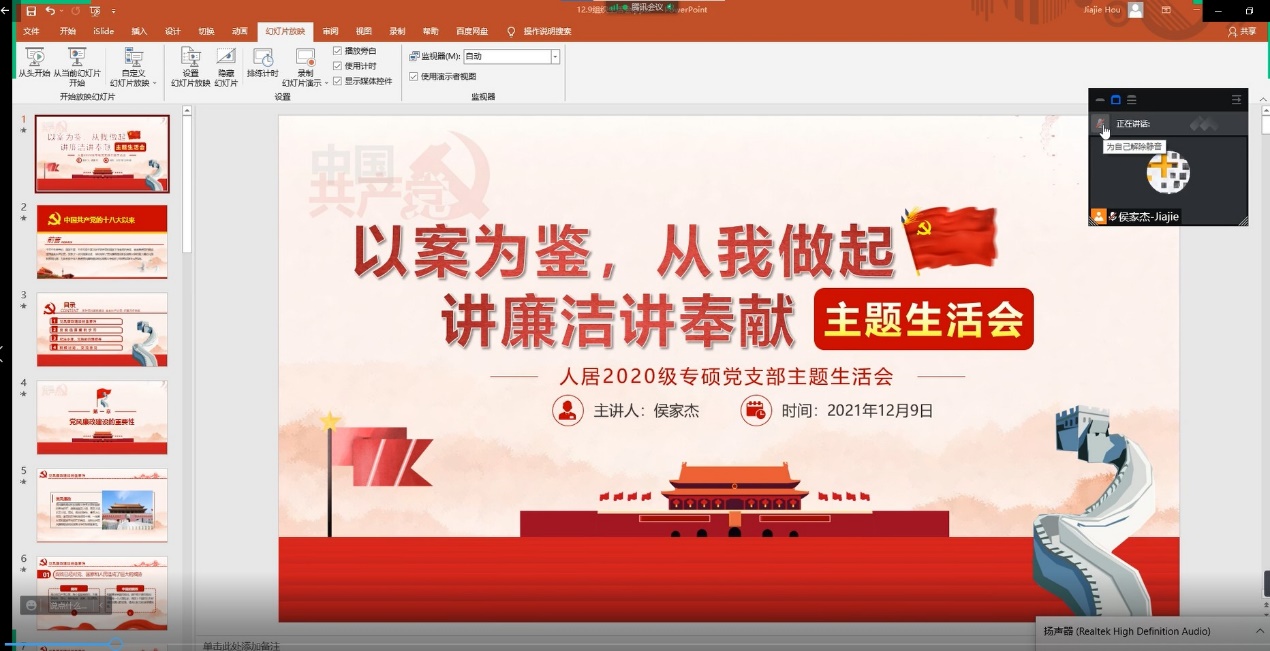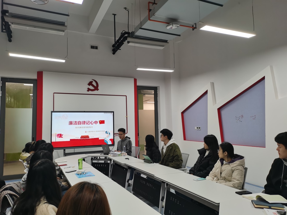 2021年12月8日,2021级学硕党支部全体党员同志在19号楼党员之家召开了党风廉政教育专题组织生活会,倡导党员同志需将廉洁自律记心中,会议由支部书记王亚晨同志主持。王亚晨同志主持会议会上,王亚晨同志从廉政的具体含义切入讲解,生动地讲述了廉政文化和反腐倡廉的核心价值和内容要求,并提出作为一名高校学生,不能视廉洁与己无关,而要从现在开始,遵纪守法、诚实守信、勤俭节约,从思想上断绝腐败问题。之后,王亚晨同志带...