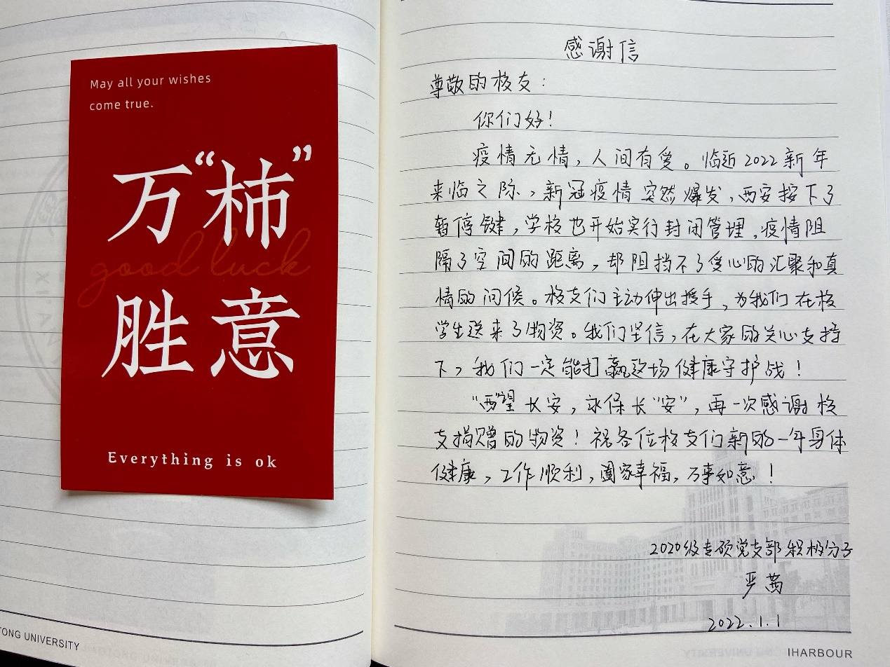 ??亲爱的土木与建筑学科校友会:见信安,先道一声“感谢”!站在2021年的尾巴,突如其来的新冠肺炎疫情在西安迅速蔓延,牵动着每个人的心,一场没有硝烟的疫情阻击战在这片熟悉的土地打响。在西安各地物资告急的时刻,广大校友纷纷行动起来,募集资金、捐赠物资。你们从五湖四海传递来对母校的关心、对师友的问候,成为这个寒意格外凛冽的冬天里,最弥足珍贵的温暖。当同学们听到这个消息时,我们拥有了水果、饼干、方便面等一...