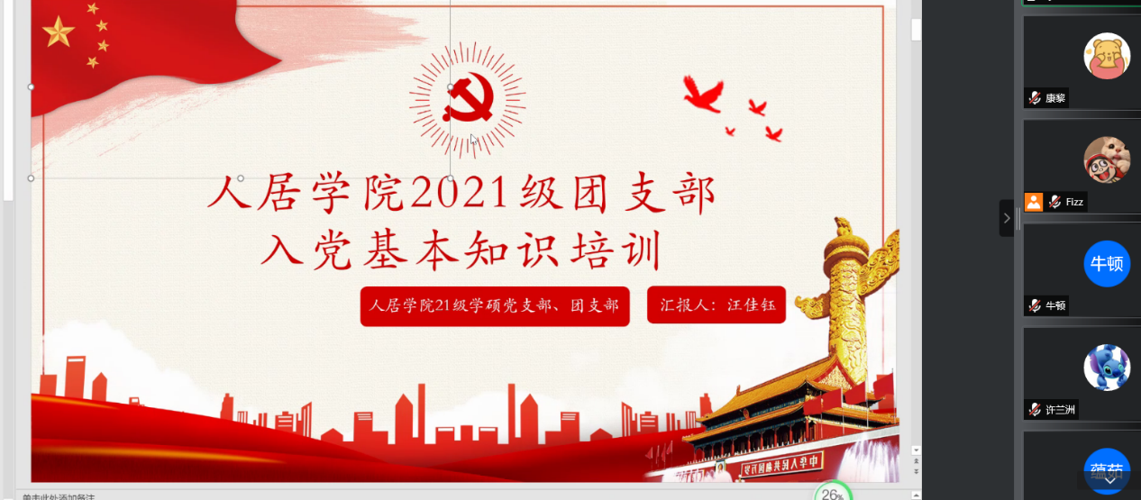 ?中国共产党始终代表着先进文化的前进方向,许多刚入学不久的新生对成为一名党员充满憧憬。2021年10月20日,2021级学硕班党、团支部通过腾讯会议线上召开了入党知识宣讲会,为研一的团员们详细介绍了入党的流程及相关的基础知识。中国共产党人的初心和使命,就是为中国人民谋幸福,为中华民族谋复兴。党支部副书记汪佳钰同志强调每一位团员同志在向党组织靠拢的任何时期都要时刻牢记中国共产党人的初心和使命。最后向各位同学...